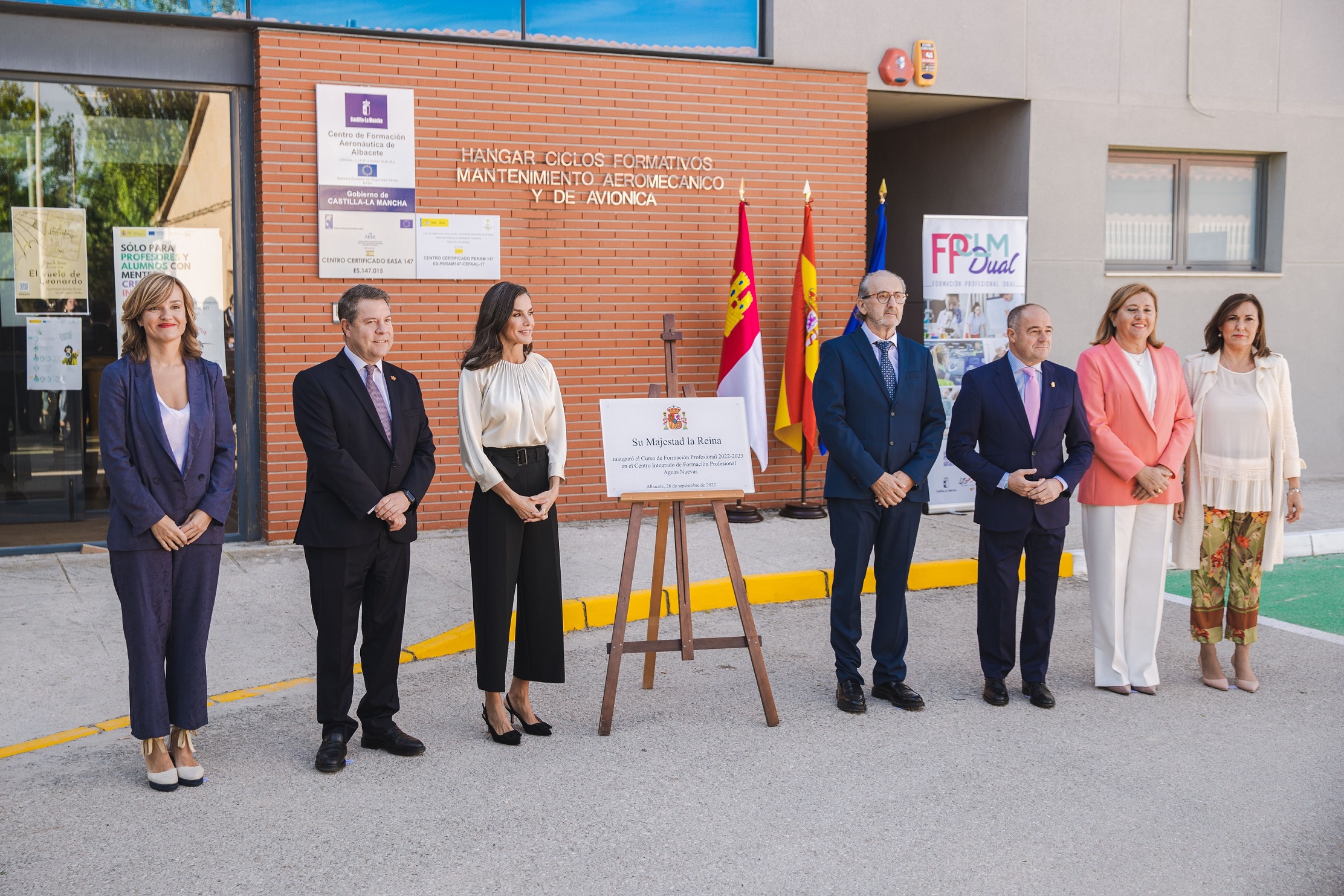 Además de la ministra Alegría, han acompañado a la Reina Letizia el presidente de la Junta de Castilla-La Mancha, Emiliano García-Page, el alcalde de Albacete, Emilio Sáez Cruz, la consejera de Educación, Cultura y Deportes, Rosa Ana Rodríguez Pérez, y la secretaria general de Formación Profesional, Clara Sanz.